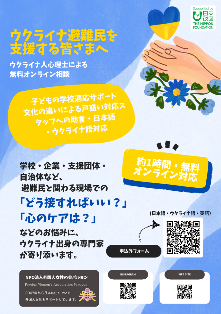 🔹 NPO法人 Paruyon(外国人女性のための支援団体) は、ウクライナ避難民を支援している団体や機関、企業の皆さまを対象に、無料のオンライン相談を始めました。ウクライナ避難民の支援経験が豊富なウクライナ人心理士が皆さまの状況に寄り添い、助言や提案をします。
